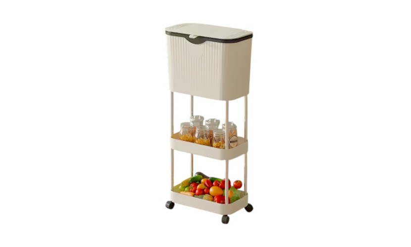 Tροχήλατο καρότσι οργάνωσης κουζίνας τριών επιπέδων με ενσωματωμένο κάδο απορριμμάτων.Πρακτικός ευέλικτος σχεδιασμός, μπορεί να χρησιμοποιηθεί στην κουζίνα, στο μπάνιο, στο γραφείο, ή σε οποιοδήποτε δωμάτιο με περιορισμένο χώρο.Κατασκευάζεται από ανθεκτικό πλαστικό PP (πολυπροπυλένιο) υψηλής ανθεκτικότητας. Διαθέτει ρόδες 360° περιστρεφόμενες για εύκολη μετακίνηση.
