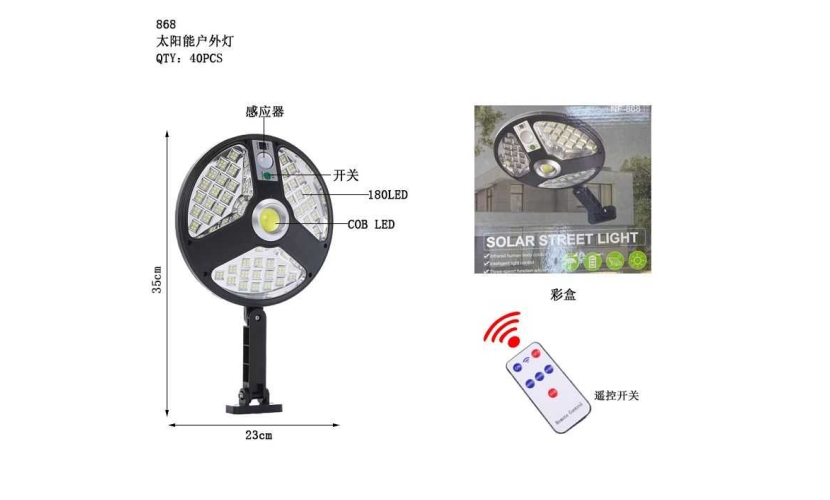 Υλικό: Polycrystalline Silico+ABSΗλιακό πάνελ: 3.7V, 3WΜπαταρία: Built-in 2 x 3.7V 1500mAh 18650 Lithium BatteryΕύρος εντοπισμού αισθητήρα: έως 5mΓωνία φωτισμού: 120°Lumen: 300-400 LumensWaterproof Grade: IPX65Διαστάσεις: 30 * 21 * 4.5cmΒάρος: 353g