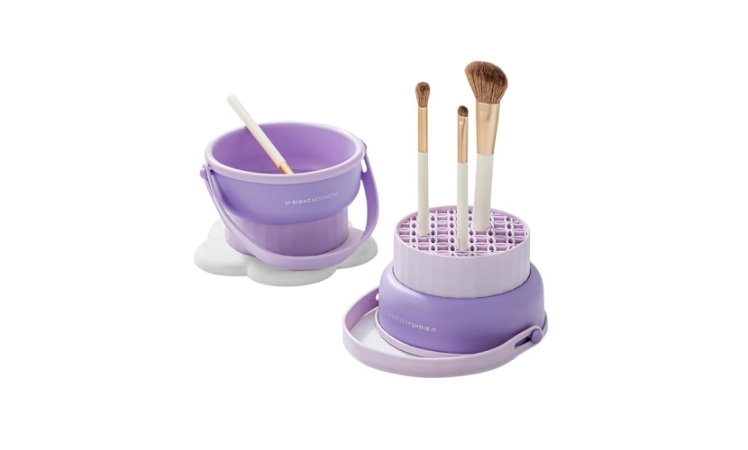 Βάση καθαρισμού και τοποθέτησης πινέλων μακιγιάζ, πλαστική, διπλής όψης, με ειδικά δοντάκια από υποαλλεργική σιλικόνη για εύκολο τρίψιμο και καθαρισμό των πινέλων σας και βάση στεγνώματος και τοποθέτησης με ελαστικές θήκες που προσαρμόζονται στη διάμετρο του πινέλου σας. Τα πινέλα μπορούν να τοποθετηθούν είτε προς τα επάνω είτε προς τα κάτω για γρηγορότερο στέγνωμα, χάρη στην ειδική χειρολαβή-κρεμάστρα.