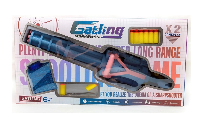 Παιδικό όπλο-Soft Gun με στόχο και εντυπωσιακό σχεδιασμό. Διαθέτει 2 ειδών σφαίρες:-μαλακές σφαίρες αφρού και -δοχείο με σφαίρες μπίλιες τζελ. Όπλισέ το και ετοιμάσου για ένα συναρπαστικό παιχνίδι δράσης!