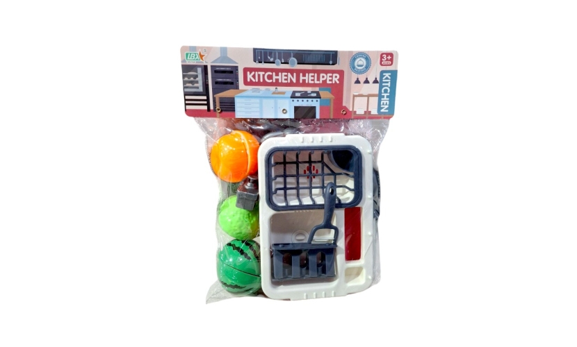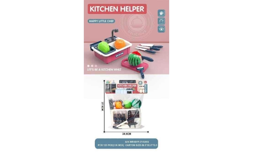 Παιχνίδι νεροχύτης κουζίνας με αξεσουάρ σκεύη και τρόφιμα, σε υπέροχο πολύχρωμο σχεδιασμό.