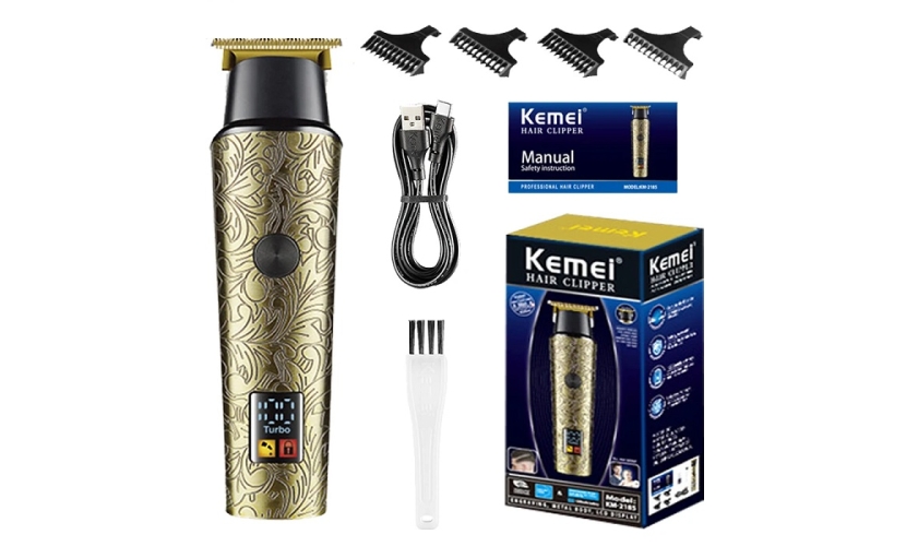 Eπαναφορτιζόμενη κουρευτική μηχανή της Kemei, με λεπίδα ακριβείας από ανοξείδωτο ατσάλι και εντυπωσιακό μεταλλικό design με ανάγλυφα σχέδια. Κατάλληλη για κάθε είδους περιποίηση σε μαλλιά, γένια και σώμα. Χαρακτηριστικά: Ισχύς: 5W, Ρυθμιζόμενη λεπίδα, Ψηφιακή οθόνη LED, Επαναφορτιζόμενη μπαταρία λιθίου 600mAh, Χρόνος φόρτισης: 2 ώρες, Χρόνος λειτουργίας: 120 λεπτά, 4 χτενάκια για διαρετικά μήκη κοπής, Λεπίδα από ανοξείδωτο ατσάλι, πλάτους 40mm, Διαστάσεις: 15*4cm. Η συσκευασία περιλαμβάνει: 1 x Κουρευτική μηχανή, 1 x Καλώδιο φόρτισης USB, 4 x Χτενάκια, 1 x Βούρτσα καθαρισμού, Λάδι λίπανσης, 1 x Οδηγίες χρήσης στα Αγγλικά.