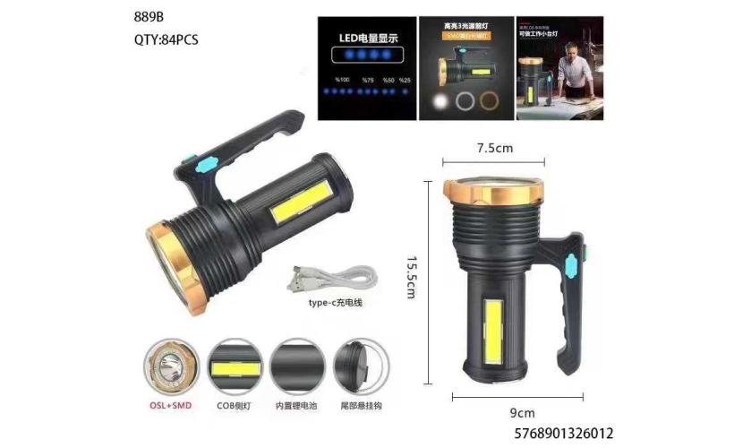 Πλαϊνός φακός COB Κεντρικός φακός με 18 LEDs ΧειρολαβήΈνδειξη φόρτισης μπαταρίας. Υλικό: pvc Διαστάσεις: 15x10cm
