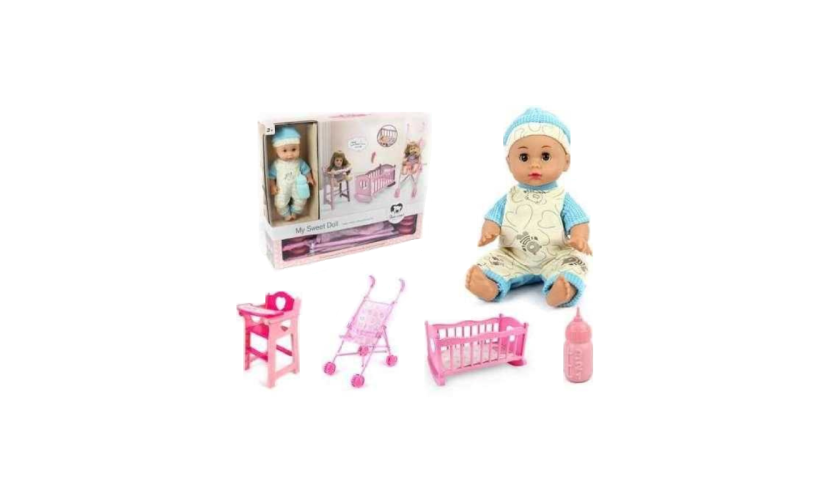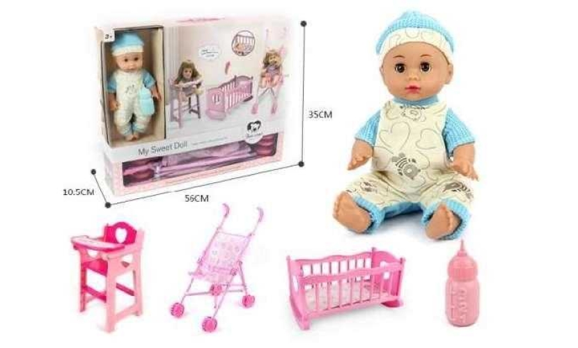 Κούκλα μωρό με πλήρες σετ κρεβατάκι, καρεκλάκι φαγητού, και καρότσι για να φροντίσεις την κούκλα σου σαν ένα πραγματικό μωράκι!
