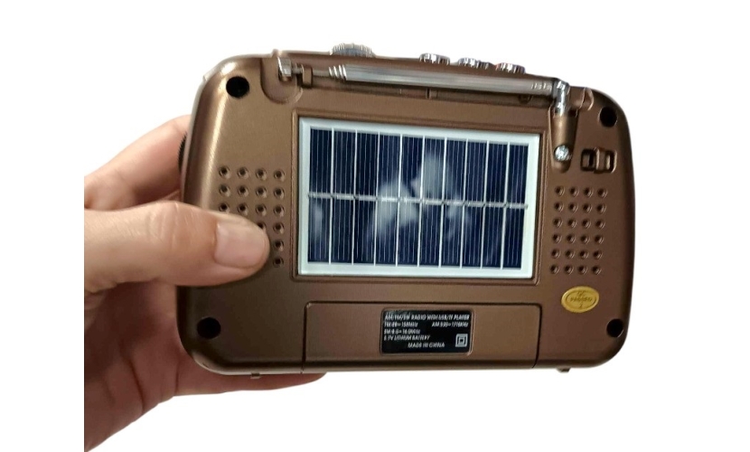 Χαρακτηριστικά:Ηλιακό πάνελ, Ενσωματωμένη επαναφορτιζόμενη μπαταρία 3.7V 18650Αυτονομία έως και 4 ώρεςRadio bands: AM, FM, SWTuner: ΑναλογικόΔέχεται: USB/TF Card/Jack 3.5mm BluetoothΙσχύς ηχείου: 57mm, 4Ω, 5WΤάση φόρτισης: DC 5VΠτυσσόμενη κεραίαΛουράκι μεταφοράς.Διαστάσεις: 15*12*6cm