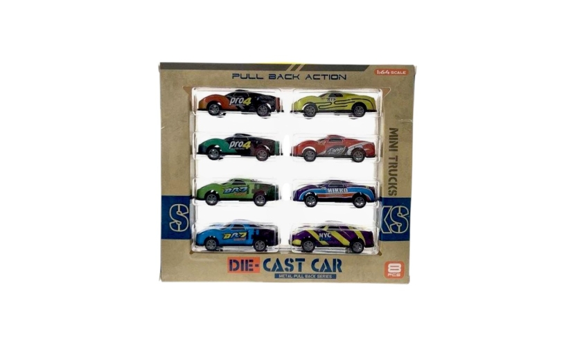 Μεταλλικά αυτοκινητάκια, σετ 8 τεμαχίων, σε διάφορα πολύχρωμα σχέδια και ποικιλία σχεδιασμού, με Pull Back. Ολοκλήρωσε τη συλλογή και ετοιμάσου για συναρπαστικούς αγώνες ταχύτητας!