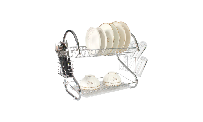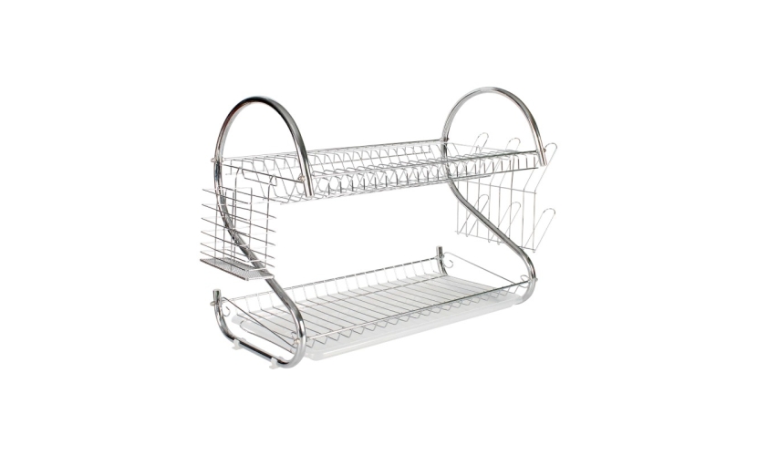 Πιατοθήκη αποστράγγισης διώροφη inox, σε πρακτικό σχεδιασμό, με θήκη μαχαιροπίρουνων και βάσεις ποτηριών. Διαθέτει πλαστική βάση συγκέντρωσης νερού. Διαστάσεις (Μ-Υ-Π): 50 x 40 x 25cm.