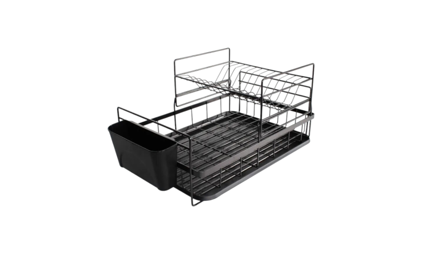 Πιατοθήκη αποστράγγισης διώροφη, μεταλλική, σε πρακτικό σχεδιασμό, με θήκη μαχαιροπίρουνων. Διαθέτει πλαστική βάση συγκέντρωσης νερού. Διαστάσεις (Μ-Υ-Π): 43 x 32 x 24 cm
