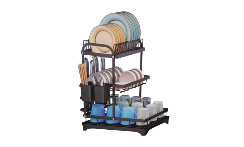 Πιατοθήκη αποστράγγισης μεταλλική, τριώροφη με θήκες μαχαιροπίρουνων. Διαθέτει αφαιρούμενη και πλενόμενη πλαστική βάση συγκέντρωσης νερού.Διαστάσεις: 50 x 40 x 30cm