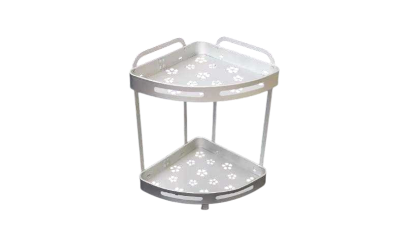 Ραφιέρα μπάνιου διώροφη γωνιακή με μεταλλικό σκελετό και πρακτικό σχεδιασμό που μπορεί να τοποθετηθεί επιτοίχια ή σε επιφάνεια. Ακτίνα ραφιού: 20cm.Πλάτος ραφιού: 23cm.Ύψος: 35cm.