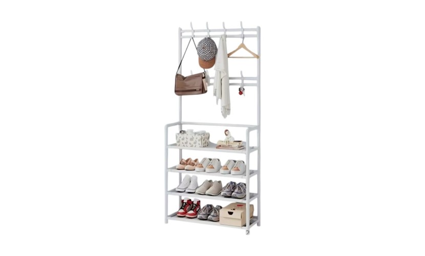 Κρεμάστρα δαπέδου μεταλλική, με 4 υφασμάτινα ράφια παπουτσιών, ιδανική ως έπιπλο εισόδου ή για την οργάνωση των ρούχων στο δωμάτιό σας . Διαστάσεις: 154 x 60 x 26 cm.