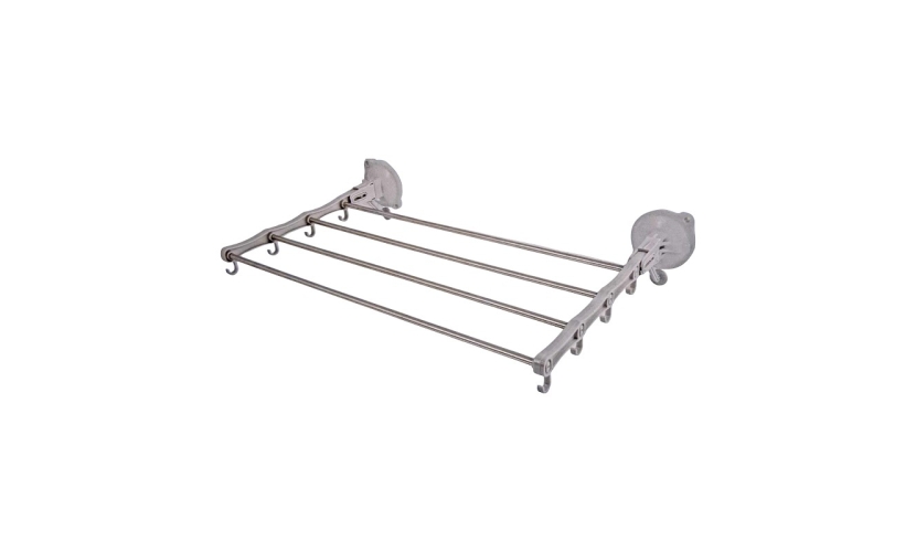 Απλώστρα ρούχων αλουμινίου με ισχυρές βεντούζες τοποθέτησης και πρακτικό σχεδιασμό. Διαθέτει τηλεσκοπικούς βραχίονες με ρυθμιζόμενο μήκος από 40 έως 70cm, ειδικά γαντζάκια για κρέμασμα μικρών ρούχων και είναι πτυσσόμενη για εξοικονόμηση χώρου.