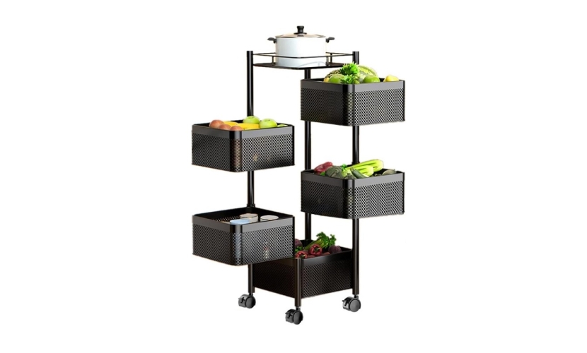 Μεταλλική ραφιέρα με 5 τετράγωνα ράφια και 4 ρόδες για εύκολη μετακίνηση. Εργονομικός σχεδιασμός με πτυσσόμενα ράφια που ανοίγουν στο πλάι για εξοικονόμηση χώρου και εύκολη καθημερινή χρήση, με ράφια μεγάλης χωρητικότητας και περιστρεφόμενες ρόδες 360° με στοπ ασφαλείας. Ιδανική για την κουζίνα, την αποθήκη, το μπαλκόνι σας ή οποιοδήποτε χώρο επιθυμείτε. Διαστάσεις: Ύψος: 95cm - Ράφι: 26 x 26 x 14cm.