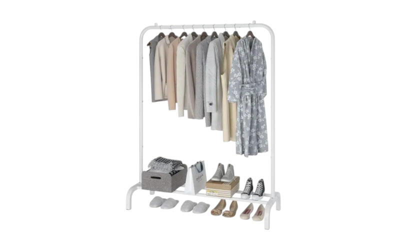 Κρεμάστρα δαπέδου μονή, μεταλλική, με ράφι παπουτσιών, ιδανική ως έπιπλο εισόδου ή για την οργάνωση των ρούχων στο δωμάτιό σας. Διαστάσεις: 150 x 110 x 40 cm.