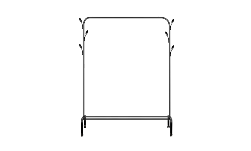 Τροχήλατη κρεμάστρα δαπέδου μονή, μεταλλική, με ράφι παπουτσιών και πλαϊνές κρεμάστρες, ιδανική ως έπιπλο εισόδου ή για την οργάνωση των ρούχων στο δωμάτιό σας. Διαστάσεις: 150 x 110 x 40 cm.