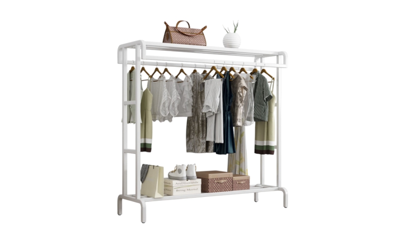 Κρεμάστρα δαπέδου μεταλλική, με ράφι παπουτσιών, ιδανική ως έπιπλο εισόδου ή για την οργάνωση των ρούχων στο δωμάτιό σας . Διαστάσεις (Υ-Μ-Π): 150 x 110 x 50 cm.