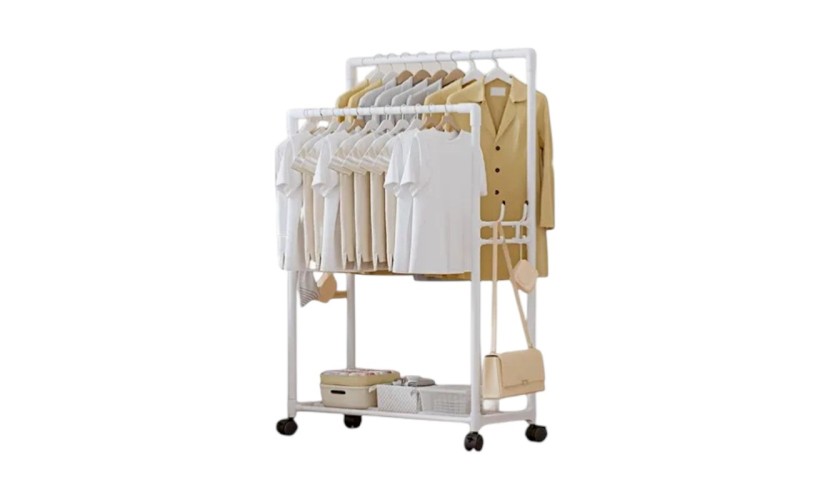 Τροχήλατη κρεμάστρα δαπέδου μεταλλική, με ράφι παπουτσιών και πλαϊνές κρεμάστρες, ιδανική ως έπιπλο εισόδου ή για την οργάνωση των ρούχων στο δωμάτιό σας. Διαστάσεις: 120 x 56 x 33 cm.