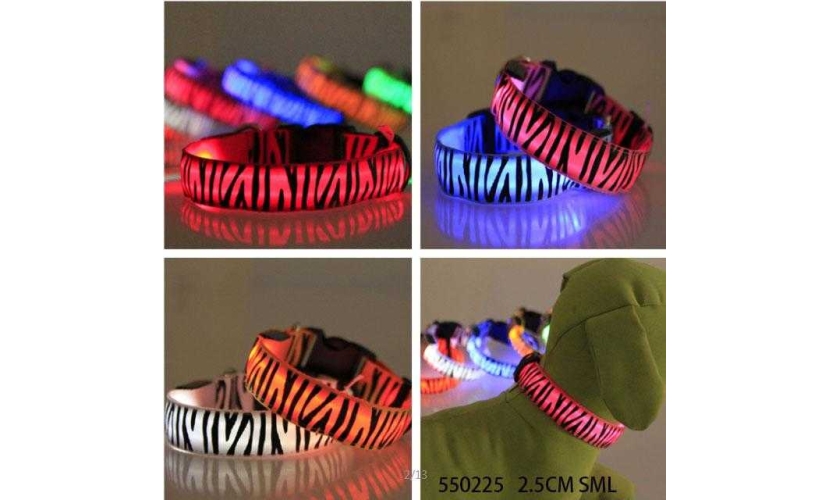 Περιλαίμιο σκύλου με φωτισμό LED, κατάλληλο για τις βραδινές σας βόλτες, καθώς προσφέρει έξτρα ασφάλεια και κάνει τον σκύλο σας εύκολα ορατό από μακριά, αποτρέποντας ατυχήματα από διερχόμενα αυτοκίνητα ή από το να τον χάσετε. Λειτουργεί με μπαταρία που περιλαμβάνεται.Ρυθμιζόμενο μήκος. Πλάτος: 2.5cm.