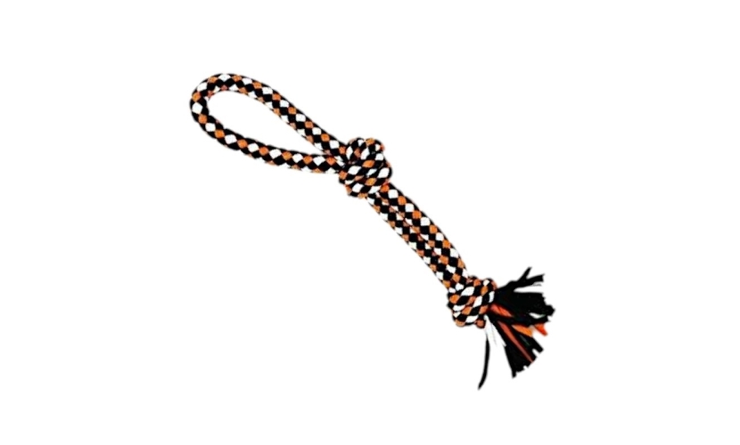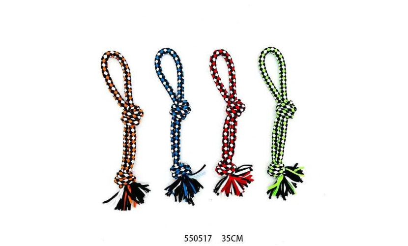 Παιχνίδι σκύλου σχοινί με κόμπους, από ελαστικό, ανθεκτικό, μη τοξικό πολυεστέρα, ιδανικό για παιχνίδια τραβήγματος/αντίστασης ενώ παράλληλα βοηθά στην υγιεινή στόματος του σκύλου σας καθώς καθαρίζει ήπια και απασχολεί τα δόντια του. Συνολικό μήκος: 35cm.