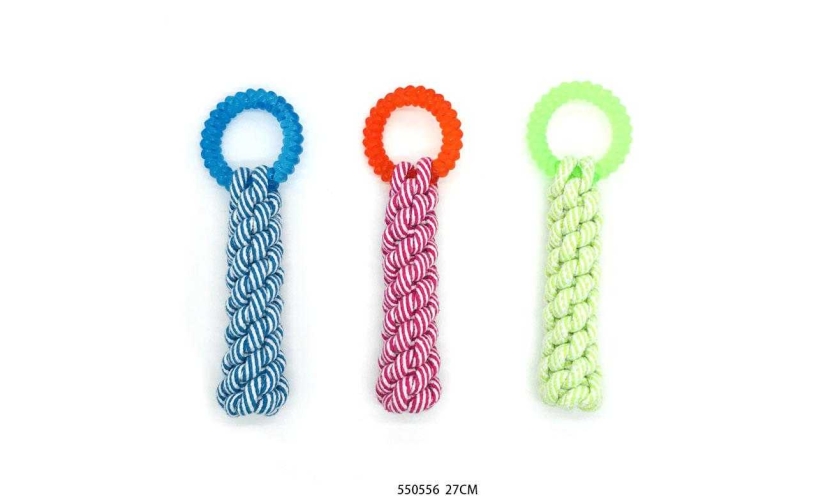 Παιχνίδι σκύλου σχοινί με κόμπους και κρίκο μασητικό, από ανθεκτικό, μη τοξικό πολυεστέρα, ιδανικό για παιχνίδια τραβήγματος/αντίστασης ενώ παράλληλα βοηθά στην υγιεινή στόματος του σκύλου σας καθώς καθαρίζει ήπια και απασχολεί τα δόντια του.
