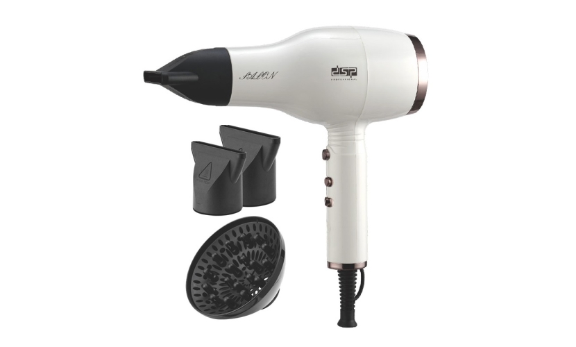 Πιστολάκι μαλλιών DSP, υψηλής ισχύος, με δυνατή ροή αέρα για γρήγορο στέγνωμα και φορμάρισμα των μαλλιών. Παρέχει λειτουργία ιονισμού, μια τεχνολογία που βοηθάει στο να μην ηλεκτρίζονται τα μαλλιά, προσφέρει περισσότερο όγκο και δεν επιτρέπει το φριζάρισμά τους. Διαθέτει 2 επίπεδα ρύθμισης θερμοκρασίας και 2 επίπεδα έντασης αέρα καλύπτοντας κάθε ανάγκη περιποίησης. Περιέχει 2 ακροφύσια χτενισμάτων και φυσούνα. Κατάλληλο για επαγγελματική χρήση.