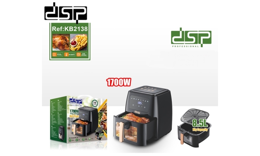 Η DSP φέρνει την νέα τάση μαγειρικής στην κουζίνας σας! Μαγειρέψτε γρήγορα, οικονομικά και απολύτως υγιεινά με την φριτέζα αέρος που θα γίνει αναπόσπαστο κομμάτι της καθημερινής μαγειρικής σας. Ψήνει άψογα, χάρη στην τεχνολογία ομοιόμορφης κατανομής και κυκλοφορίας του αέρα 360°, χωρίς απώλειες και χωρίς να καίει. Το ψήσιμο είναι πολύ πιο υγιεινό καθώς δεν χρειάζεται να προσθέσετε καθόλου λάδι ή άλλα πρόσθετα, ενώ το φαγητό θα αποβάλει τα περιττά λίπη του διατηρώντας την απαραίτητη υγρασία που χρειάζεται. Επιπλέον, θα μαγειρεύετε πολύ πιο οικονομικά από τον οικιακό ενεργοβόρο φούρνο σας. Γνωρίστε τη νέα γενιά μαγειρέματος από την DSP!