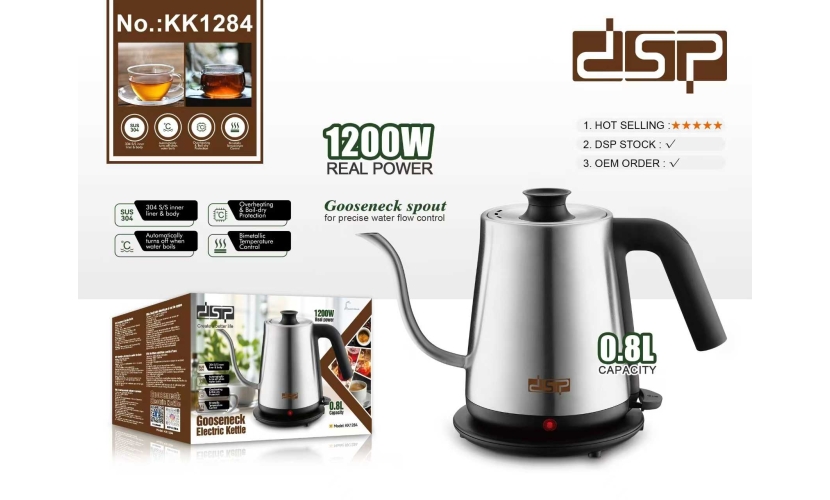 Ηλεκτρικός βραστήρας inox της DSP, τύπου Kettle, υψηλής ισχύος και άμεσης θέρμανσης, με στόμιο έγχυσης και πρακτικό σχεδιασμό.