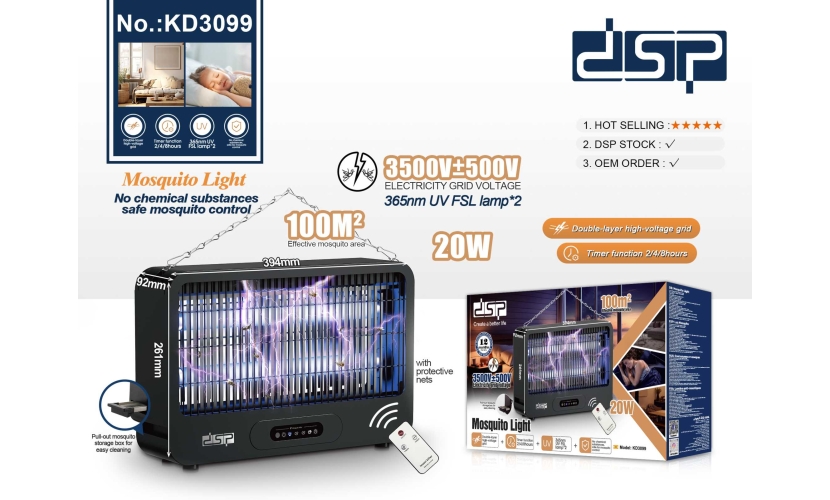 Χαρακτηριστικά:Ισχύς: 20WΤροφοδοσία ρεύματος,Κάλυψη έως 100τμ. ,2 σωληνωτές λάμπες φθορίου, μήκους κύματος 365nm με ισχύ τάσης 3500V και διάρκεια ζωής έως 6000 ώρες,Χρονοδιακόπτης για 2/4/8 ώρες,Συλλέκτης κουνουπιών αφαιρούμενος και πλενόμενος,Προστατευτικό πλέγμα,Αλυσίδα-χειρολαβή-κρεμάστρα,Τηλεχειριστήριο πλήρους χειρισμού, Διαστάσεις: 39.4 x 26 x 9.2 cm.