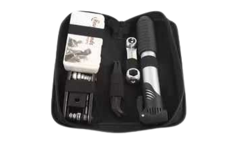 Περιλαμβάνονται:-μίνι τρόμπα φουσκώματος-μίνι κιτ επισκευής ελαστικού-κλειδί-καστάνια-πολυεργαλείο Άλεν