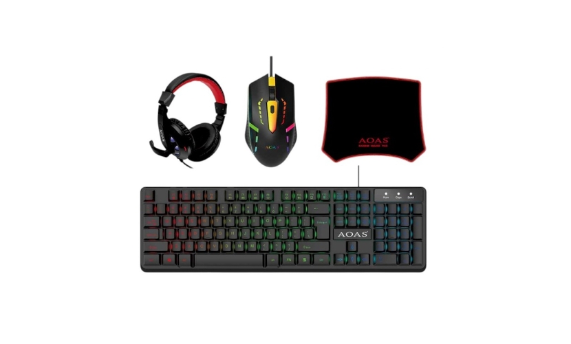 Πλήρες σετ Gaming 4 σε 1 της AOAS με ενσύρματο πληκτρολόγιο, ακουστικά, ποντίκι και mousepad, υψηλής απόδοσης, με εργονομικό σχεδιασμό και εντυπωσιακό φωτισμό RGB, για ατελείωτη εμπειρία Gaming!