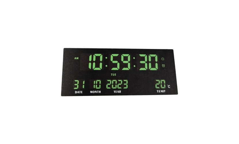 Ψηφιακό ρολόι τοίχου υψηλής ανάλυσης και φωτεινότητας με ένδειξη ημερομηνίας, ώρας και θερμοκρασίας δωματίου, κατάλληλο για οικιακή και επαγγελματική χρήση όπως μαγαζιά, βιτρίνες κ.α.