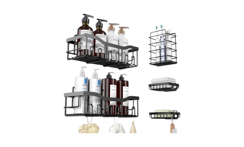 Σετ επιτοίχια ράφια οργάνωσης μπάνιου, με 2 ράφια, 2 θήκες σαπουνιού/σφουγγαριού και 1 θήκη για οδοντόβουρτσες.Τα ράφια διαθέτουν πρακτικά κρεμαστράκια για κρέμασμα πολλαπλών αξεσουάρ. Μπορούν να τοποθετηθούν τόσο στο μπάνιο όσο και στην κουζίνα σας. Μεταλλική κατασκευή υψηλής ανθεκτικότητας.