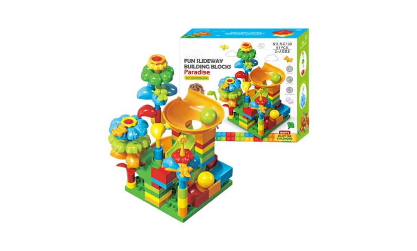 Συναρμολογούμενη πίστα DIY με τουβλάκα και τσουλήθρα με μπαλάκια που κάνουν τρελά κόλπα, για ένα ατελείωτο δημιουργικό παιχνίδι!