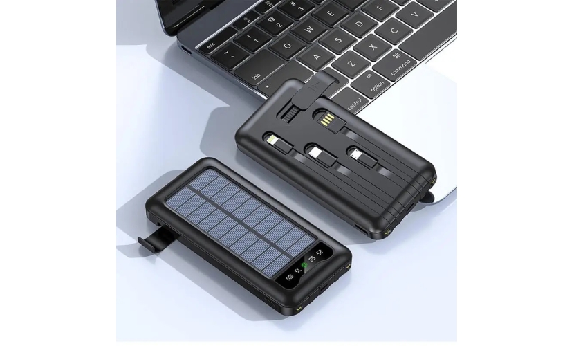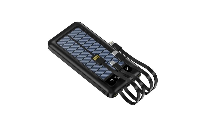 Powerbank 4 σε 1 με 4 ενσωματωμένα καλώδια φόρτισης (Type C, Micro USB, Lightning, USB) και χωρητικότητα 10000mAh.Διαθέτει ηλιακό πάνελ μέσω του οποίου μπορεί να φορτίσει με έκθεση στον ήλιο, στοιχείο που το καθιστά ιδανική επιλογή για προορισμούς χωρίς πρόσβαση σε παροχή ρεύματος (πχ πεζοπορία, camping κτλ).Μπορεί να προσφέρει περίπου 2 πλήρεις φορτίσεις σε ένα κοινό κινητό τηλέφωνο.