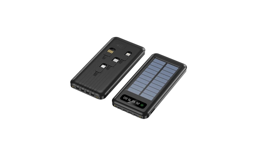 Powerbank 4 σε 1 με 4 ενσωματωμένα καλώδια φόρτισης (Type C, Micro USB, Lightning, USB) και χωρητικότητα 10000mAh.Διαθέτει ηλιακό πάνελ μέσω του οποίου μπορεί να φορτίσει με έκθεση στον ήλιο, στοιχείο που το καθιστά ιδανική επιλογή για προορισμούς χωρίς πρόσβαση σε παροχή ρεύματος (πχ πεζοπορία, camping κτλ).Μπορεί να προσφέρει περίπου 2 πλήρεις φορτίσεις σε ένα κοινό κινητό τηλέφωνο.
