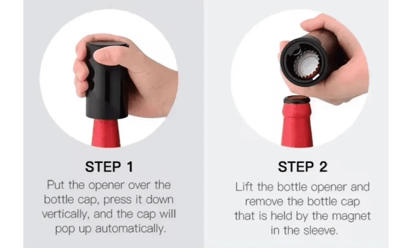 Aυτόματο ανοιχτήρι μπουκαλιών με μαγνήτη, για πανεύκολο άνοιγμα των μπουκαλιών μπύρας και αναψυκτικών με μία κίνηση: απλά τοποθετήστε το εργαλείο επάνω στο καπάκι μέχρι να κουμπώσει και τραβήξτε. Το καπάκι αφαιρείται και παραμένει μέσα χάρη στον ειδικό μαγνήτη, από όπου μπορείτε να το αφαιρέσετε χωρίς να πέσει και χωρίς να στραβώσει, ώστε να μπορείτε να το επαναχρησιμοποιήσετε. Ένα πρακτικό εργαλείο που δεν πρέπει να λείπει από την κουζίνα σας!