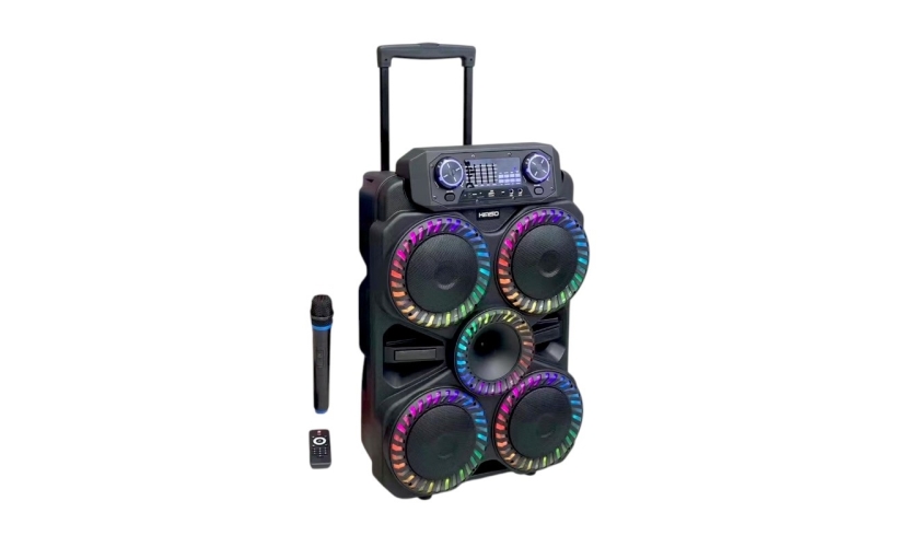 Φορητό ηχείο subwoofer με τετραπλό ηχείο και εξαιρετικής ποιότητας ήχο, με εντυπωσιακό φωτισμό LED που προσαρμόζεται στο ρυθμό της μουσικής και πρακτικό σχεδιασμό μεταφοράς. Περιλαμβάνει ασύρματo μικρόφωνo καραόκε και τηλεχειριστήριο για εύκολο χειρισμό.