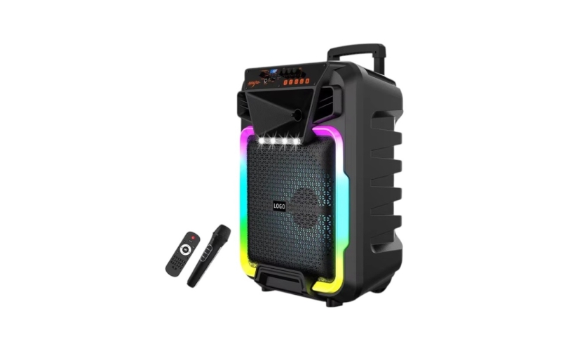 Φορητό ηχείο subwoofer με εξαιρετικής ποιότητας ήχο, εντυπωσιακό φωτισμό LED που προσαρμόζεται στο ρυθμό της μουσικής και πρακτικό σχεδιασμό μεταφοράς. Περιλαμβάνει ασύρματo μικρόφωνo καραόκε και τηλεχειριστήριο για εύκολο χειρισμό.