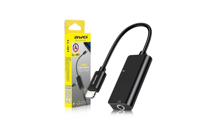 Αντάπτορας που συνδέει έναν αρσενικό ακροδέκτη Lightning με μια θηλυκή θύρα 3.5mm και μια Lightning.