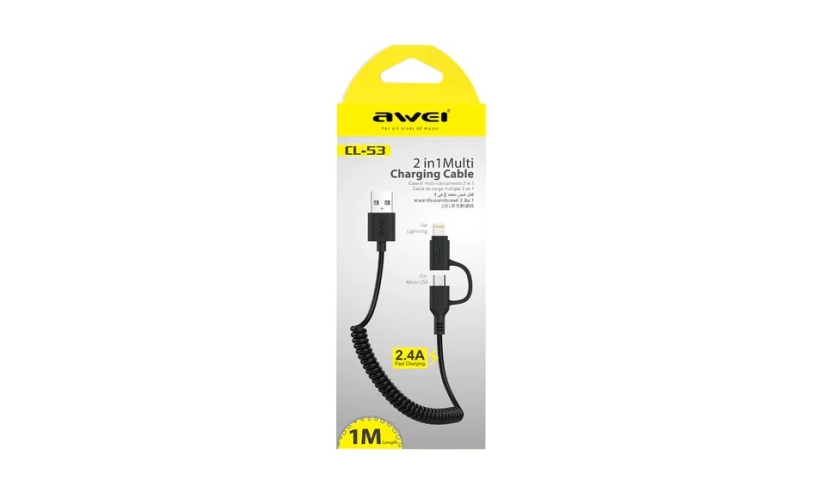 Μulti port καλώδιο φόρτισης & data 2in1 - Fast Charge της Awei με διπλό εναλλασσόμενο βύσμα Micro USB και Lightning. Διαθέτει σπιράλ καλώδιο που σας εξοικονομεί χώρο ενώ αποτρέπει τα ενοχλητικά μπερδέματα και τους κόμπους, καθιστώντας το ανθεκτικό στη χρήση και στα τραβήγματα.Ακροδέκτες: Lightning, micro USB. Μήκος: 1m (σε έκταση). Υλικό καλωδίου: TPEΙσχύς micro USB: 2.4AΙσχύς Lightning: 2.4A