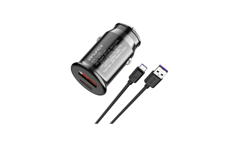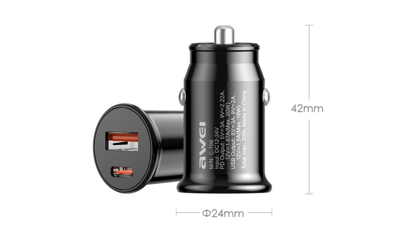 Υψηλής απόδοσης USB φορτιστής αυτοκινήτου της Awei με καλώδιο USB Type C, εξαιρετικά ανθεκτικός και συμβατός με όλες τις συσκευές που φορτίζουν μέσω USB θύρας. Ο φορτιστής C-706 είναι μικρός σε μέγεθος και το μεγαλύτερο μέρος του χωνεύει στην πρίζα του αυτοκινήτου. Είναι ελαφρύς, κομψός και διαθέτει 1 USB θύρα εξόδου που υποστηρίζει γρήγορη φόρτιση QC3.0 με μέγιστη απόδοση 18W και 1 θύρα USB Type C με μέγιστη απόδοση 20W.
