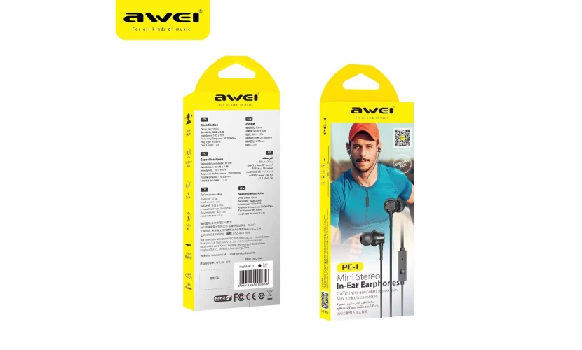 Ενσύρματα ακουστικά AWEI PC7 με υψηλής ποιότητας ήχο surround και εργονομικό σχεδιασμό in ear με ελαστικό στήριγμα για το αφτί, για άνετη εφαρμογή και απόλυτη ηχομόνωση.