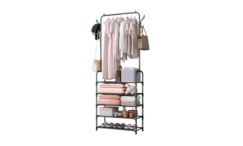 Κρεμάστρα δαπέδου μεταλλική, με 5 υφασμάτινα ράφια παπουτσιών και κρεμάστρα τσάντας, ιδανική ως έπιπλο εισόδου ή για την οργάνωση των ρούχων στο δωμάτιό σας . Διαστάσεις: 170 x 60 x 29.5 cm.
