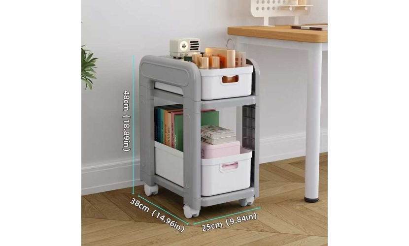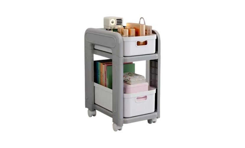 Βοηθητική πλαστική ραφιέρα 3 επιπέδων, με αφαιρούμενα κουτιά αποθήκευσης και ρόδες για εύκολη μετακίνηση, ιδανική για οργάνωση οικιακών χώρων και αποθήκης.