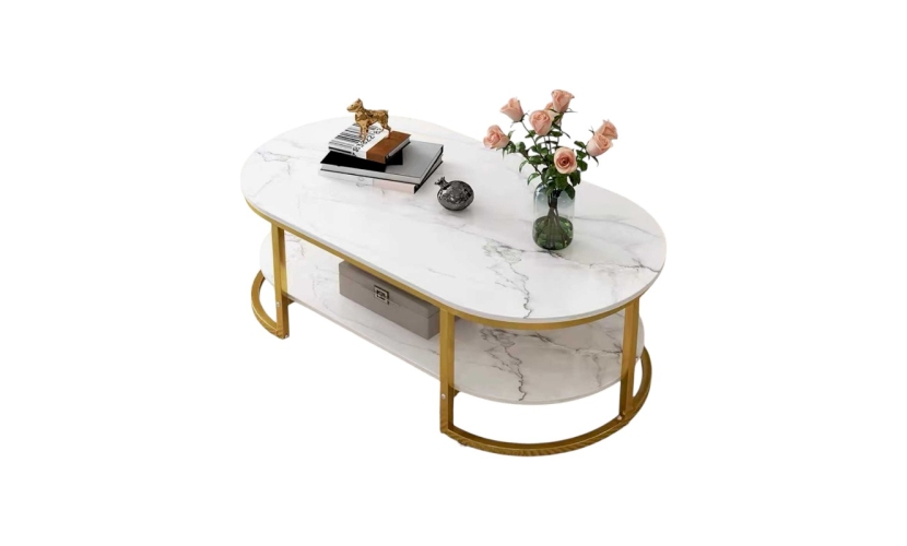 Τραπεζάκι σαλονιού διώροφο, σε μοντέρνο σχεδιασμό που θα προσδώσει πολυτέλεια και πρακτικότητα στο χώρο σας. Μεταλλικός σκελετός χάλυβα.Επιφάνεια MDF & λάκα με εφέ μαρμάρου.