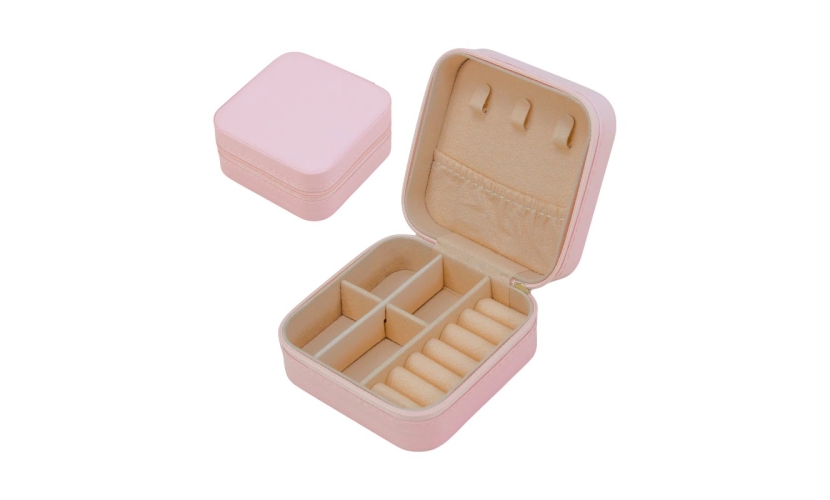 Θήκη οργάνωσης κοσμημάτων mini με φερμουάρ, με επένδυση δερματίνης και βελουτέ βάση, με πολλαπλές θήκες και ειδικές θέσεις για δαχτυλίδια και κολιέ. Διαστάσεις: 10 x 10 x 5cm
