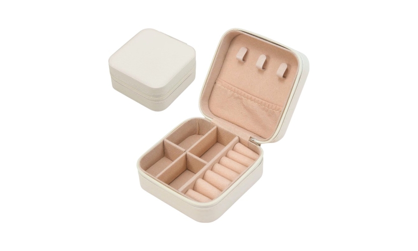 Θήκη οργάνωσης κοσμημάτων mini με φερμουάρ, με επένδυση δερματίνης και βελουτέ βάση, με πολλαπλές θήκες και ειδικές θέσεις για δαχτυλίδια και κολιέ. Διαστάσεις: 10 x 10 x 5cm