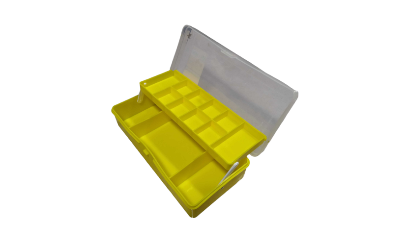 Πλαστικό κουτί-κασετίνα με 2 επίπεδα, ιδανικό για την αποθήκευση και μεταφορά των αξεσουάρ αλιείας σας, με πολλαπλές θήκες και διαχωριστικά.