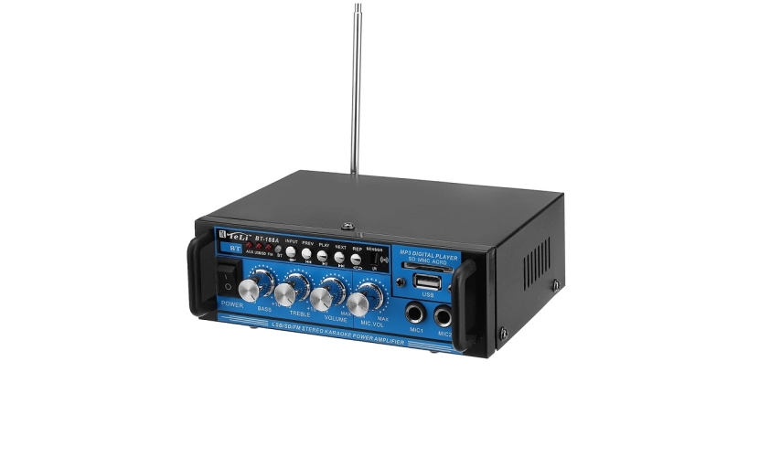 Bluetooth ενισχυτής ήχου με λειτουργία Karaoke BT-188A, με τηλεχειριστήριο, επεκτάσιμη κεραία και λειτουργία ραδιοφώνου FM. Διαθέτει είσοδο USB και SD και έλεγχο έντασης ήχου, μπάσων και πρίμων για να ακούτε ευχάριστα την αγαπημένη σας μουσική.