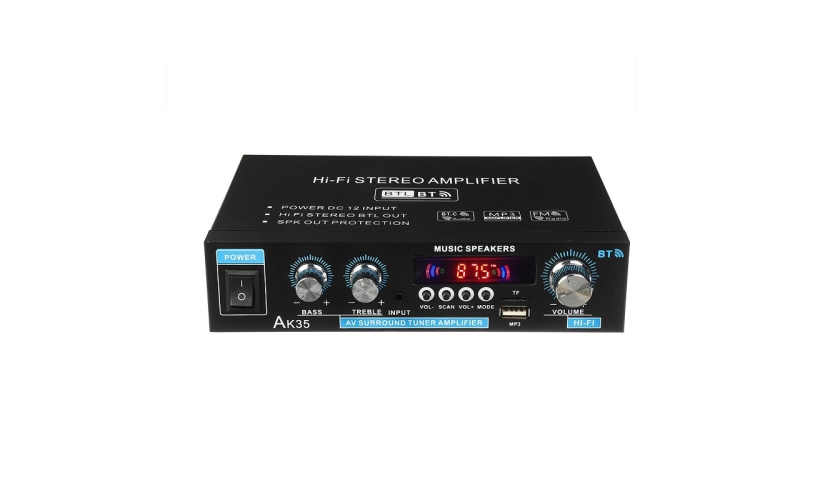 Ψηφιακός ενισχυτής ήχου Mini HIFI με Bluetooth. Χαρακτηριστικά: Αντίσταση: 4-16 Ω, Αναπαραγωγή MP3, Bluetooth, Θύρες: SD/USB/AUX, Ραδιόφωνο FM, Ρυθμιστές Tremble & Bass, Ισχύς RMS: 30Wx2, Μέγιστη ισχύς: 300W+300W, Κανάλι: 2.0 - Δύο κύριες έξοδοι καναλιού, SNR: 85 db, Συχνότητα FM: 87,5-108MHz, Ποσοστό παραμόρφωσης: 0,05%, Συχνότητα: 10Hz-20KHz, Τηλεχειριστήριο, Διαστάσεις: 19 x 12.5 x 4.5cm.